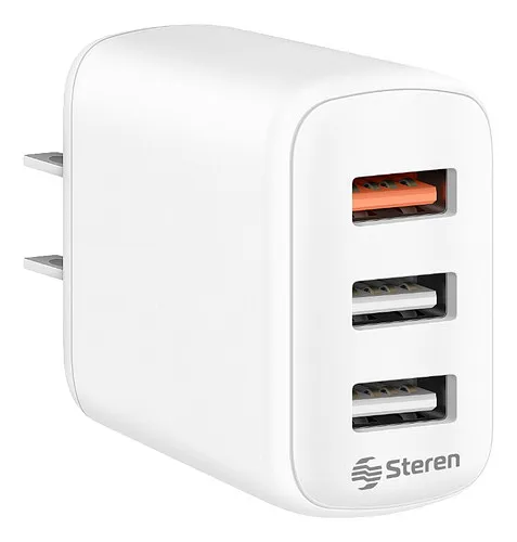 Optimiza tu tiempo de carga y mantén todos tus dispositivos listos para la acción con este cargador de pared. Su diseño de triple puerto te permite cargar simultáneamente hasta tres equipos, incluyendo uno con tecnología de carga rápida (QC 3.0 de 18W) para aquellos momentos en que necesitas energía al instante, y dos puertos USB estándar (12W) ideales para tus otros gadgets. Olvídate de los adaptadores múltiples y disfruta de la comodidad y eficiencia que te ofrece una solución de carga centralizada y de alta calidad.